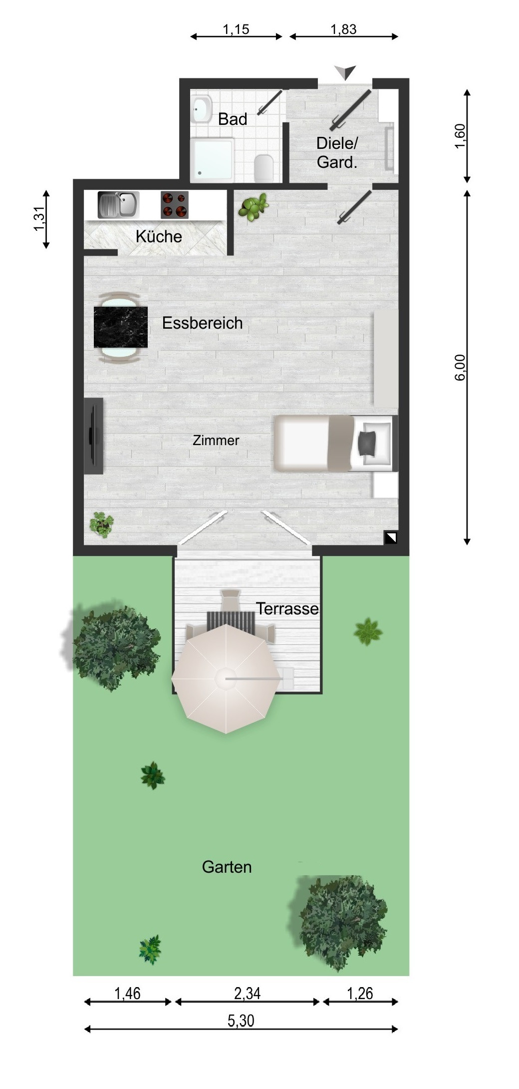 Ein Flur mit Garderobe, ein Badezimmer mit Dusche, ein kleiner Küchenbereich und ein Wohn-Schlaffbereich mit Ausgang zur Terrasse und zum Garten.