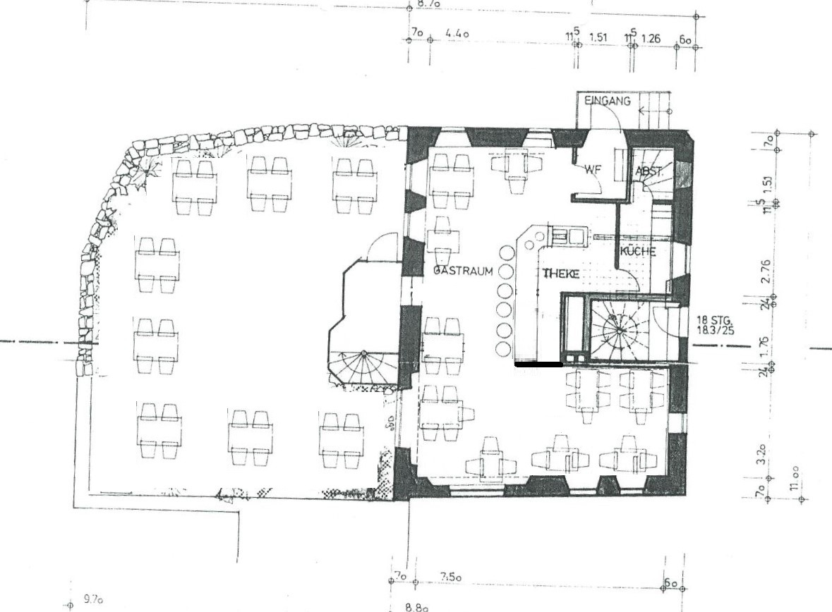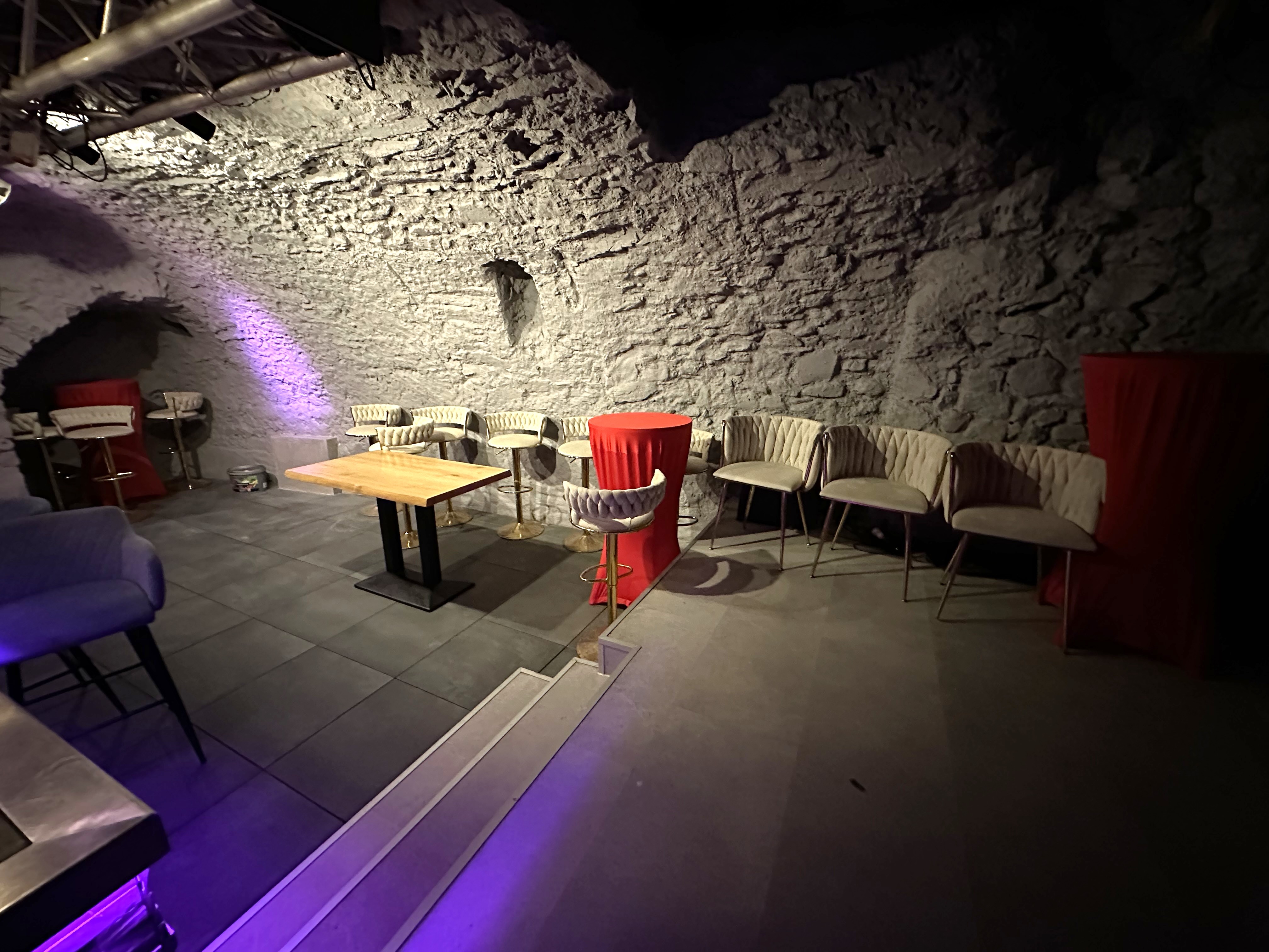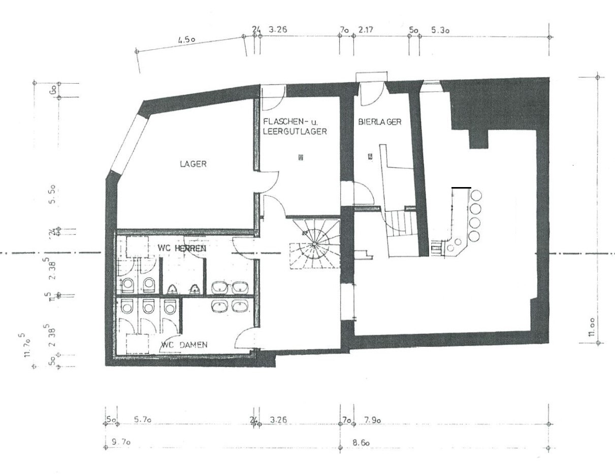 Im Untergeschoss befinden sich die Herren und Damen WC`s, die Lagerräume, das Kühlhaus, die Bar mit Loungebereich und separaten Eingang.